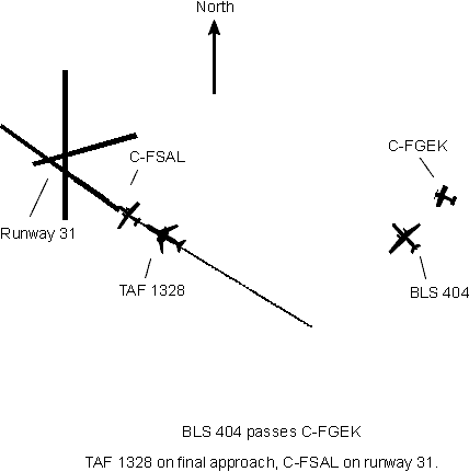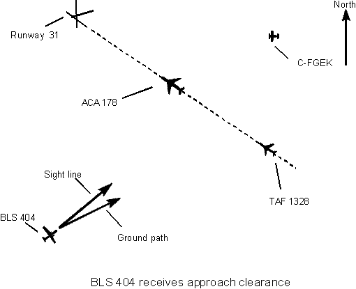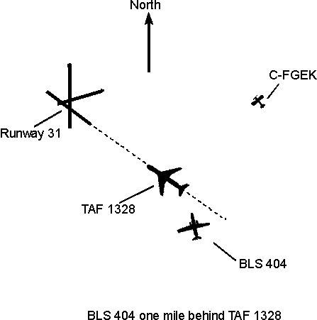 The Fairchild Metro III (BLS 404) arrived in the Winnipeg terminal control area on an instrument flight rules (IFR) flight from Brandon, Manitoba, to the Winnipeg International Airport, Manitoba. Air Canada flight 178 (ACA 178), a McDonnell-Douglas DC-9, was the first aircraft in sequence on approach for runway 31, followed by the Fokker F-28 (TAF 1328).