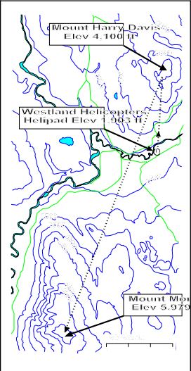 He further stated that, during his flight, he was able to climb above the fog layer by flying up the rising terrain of Mount Harry Davis and using the trees as visual reference. While in the climb, he stated that he was able to see a distance of "about four or five tree-top lengths" (assumed to mean he could see four or five tree-tops ahead of him while flying) and that he was clear of the fog at 3,800 feet asl. He characterized these conditions as "helicopter VFR." Conditions above the fog were described as clear with only high scattered cloud.
