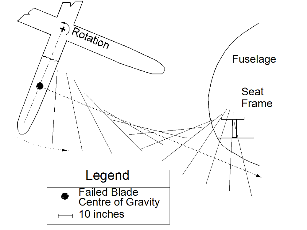 The top of the No. 2 blade punctured the fuselage as the blade passed on its trajectory toward and beneath the aircraft. A vertical cut measuring 104 cm by 2.5 cm was observed between stations 9157 and 9333 on the right side of the fuselage. The seat adjacent to the vertical cut was partially cut. Two landing gear hydraulic lines mounted under the floor were slightly bent. (See Figure 1 - Blade Trajectory.)