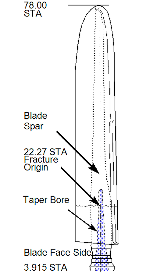 The fracture surface showed fatigue marks originating in the spar bore on the face side of the blade. Approximately 80 per cent of the fracture surface exhibited fatigue cracks; damage on the remainder of the fracture surface was attributable to overload failure. Metallurgical analysis revealed that a corrosion pit 0.1524 cm in the circumferential direction, 0.0762 cm into the material (radial direction) and 0.1447 cm in the axial direction was the point of origin of the fatigue crack. Tensile stresses were greatest on the face side of the bore where the crack originated.