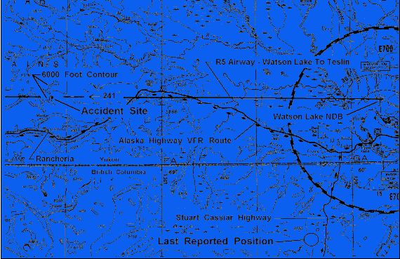 The Alaska Highway is, itself, a primary visual navigation aid for VFR pilots flying through northern British Columbia and the Yukon. The accident occurred approximately 6 nm north of the highway.