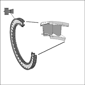 The engine HPTN is a single-stage, air-cooled assembly which directs the gas flow from the combustion chamber to the HPT rotor blades. The assembly is made up of 21 nozzle segments, and each segment has two guide vanes. High pressure compressor discharge air, used for cooling, enters each vane through the nozzle segment inner and outer platforms and exits through holes in the leading and trailing edges of the guide vanes.
