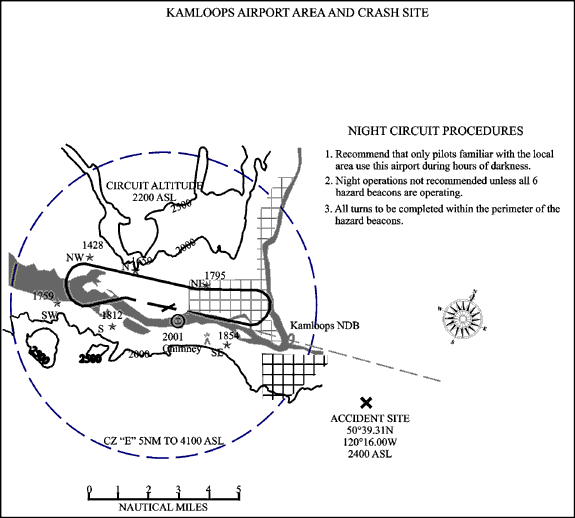 The instrument approach procedure to runway 26 at Kamloops uses a non-directional beacon and a localizer that is aligned, in part, with the valley of the South Thompson River. Although the valley floor is at an elevation of about 1,200 feet asl, the terrain on both sides of the valley rises to at least 3,000 feet. The accident occurred on high ground, outside the area that is normally used for night VFR circuits.