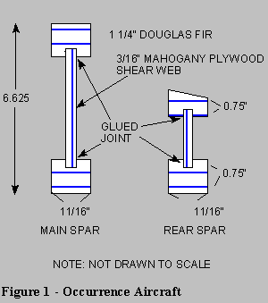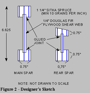 The Cuby II aircraft is a two-place, side-by-side, high-wing, conventional-gear monoplane. The designer's sketch specifies the cross-sectional dimensions of the spar caps as follows: the top main wing spar caps are to be constructed of 1¼ inch high by ¾ inch wide Sitka spruce; the lower spar caps are to be 1 inch high by ¾ inch wide, and also of Sitka spruce. The main spar caps are to be joined by ¼ inch wide Douglas fir shear webbing.