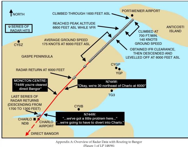 On Sunday, 20 October 1996, the Chieftain departed Port Menier at 1113Footnote 1, with one pilot and seven passengers on board on an instrument flight rules (IFR)Footnote 2 flight plan to Bangor, Maine. The flight-planned route was direct Charlo, New Brunswick, direct Houlton, Maine, and direct Bangor at 6,000 feet. The Caravan, carrying all the baggage and cargo, had departed about ten minutes earlier on the same flight-planned route at 8,000 feet.