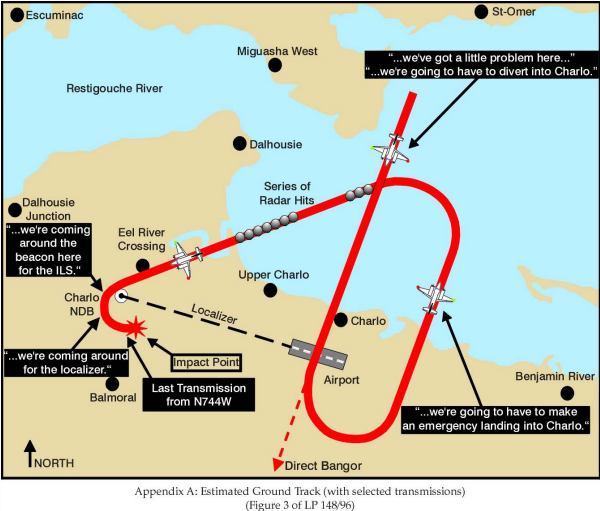 The aircraft, a Piper PA-31-350 Navajo Chieftain (hereafter referred to as a Chieftain), took off at 1113 Atlantic daylight saving time on a charter flight from Port Menier, Quebec, to Bangor, Maine, with one pilot and seven passengers on board. As the aircraft was approaching Charlo, New Brunswick, the pilot reported to Moncton Air Traffic Control Centre that his aircraft had a rough-running engine, and that he would be making an emergency landing at Charlo airport. While the pilot was apparently manoeuvring to land the aircraft, it crashed three miles west of the runway, in the community of Eel River Crossing. All eight occupants of the aircraft received fatal injuries.