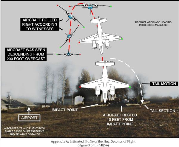 When it struck the ground, the aircraft left three main impact marks (one from each engine and one from the nose) in a straight line running north/south. The aircraft's momentum in the direction of flight carried it to the west of this line; it came to rest approximately 15 feet from the initial impact marks, upright and on a heading of 110 ° magnetic.