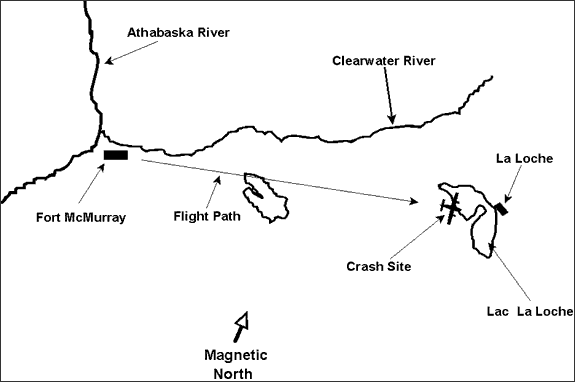 The Piper PA-34-200T Seneca departed Fort McMurray, Alberta, on a 62 nautical mile (nm) charter flight to La Loche, Saskatchewan, with a crew of one pilot and five passengers on board. The aircraft departed at 1750 mountain standard time (MST)Footnote 1, and was expected back in Fort McMurray at 1930. The pilot had filed a flight plan, and when the aircraft did not return, the Fort McMurray Flight Service Station operator (FSS) initiated a radio search to determine its whereabouts. The radio search was unsuccessful, and the FSS contacted McMurray Aviation, the operator. An airborne search party organized by the operator departed from Fort McMurray with several company pilots on board. The search party retraced the route from Fort McMurray to La Loche, but could not find the accident aircraft. Another search was organized using personnel and several fixed wing and rotary wing aircraft from Canadian Forces Base Cold Lake, Alberta, and the wreckage was located on the afternoon of the following day (see Appendix A). The pilot and one of the passengers died at the time of the accident. One passenger succumbed to her injuries the following morning, before help arrived. The three surviving passengers were taken by military aircraft to La Loche and then to Fort McMurray, with serious injuries. The aircraft was destroyed by impact forces and a post-crash fire.