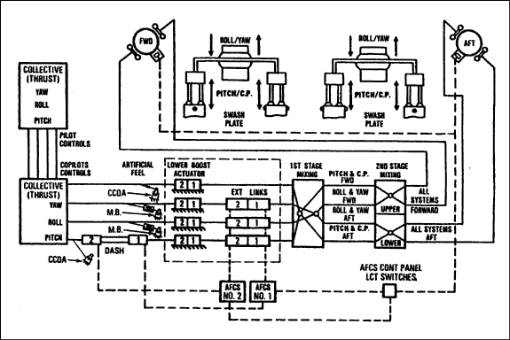 The entire flight control system consists of levers, connecting links, bellcranks, and actuators located within the cockpit, the forward cabin section, the tunnel on top of the main cabin section, the aft cabin section, and the forward transmission fairing and pylon. The flight control system transfers the pilots' cockpit control movements to the two rotor heads to maintain helicopter attitude, altitude, heading, and speed.