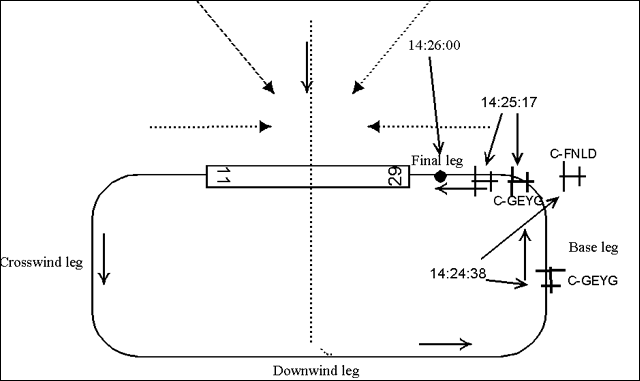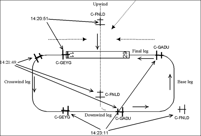| 1421:49 | When Cessna 150 C-FNLD joined the left-hand downwind leg for Runway 29, it was preceded by another aircraft that would be first in the landing sequence. At that time, Cessna 172 C-GEYG began its turn for the crosswind leg. |