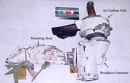 The air turbine unit was recovered missing the spinner and one of its two propeller blades. According to the dataplate, the unit was manufactured by Kaiser Marquarot (PN 226260-501, SN 0037). The air turbine unit had separated from the generator flange and had sheared five of its six mounting bolts. The threads of the remaining bolt had been stripped out of the hub. The generator flange was fixed in place and was not free to rotate owing to impact damage to the generator housing. The air turbine unit was mated with the generator flange; the orientation of the turbine blade and blade stub placed the blades in the fore and aft or stowed position. No rotational markings were noted on the turbine hub. The propeller blade exhibited no leading edge damage or chordwise marks or scratches that would indicate rotation of the blade.