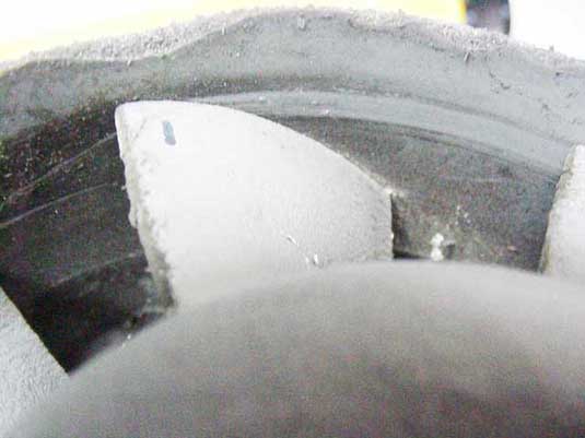The light score pattern approximately .090 inches wide around the full circumference of the inner housing is consistent with marks resulting from rotational contact with the tips of the fan impeller blade.