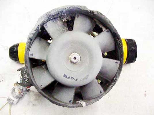 The fan housing was broken at mid-span on the exhaust side, adjacent to the stator blades and on the inlet side, adjacent to the fan blade impeller. The impeller fairing was not recovered. Although the fan housing was broken and folded over into the rotational path of two of the impeller blades, there were no rotational score marks on the face of the inner housing.