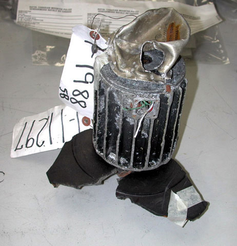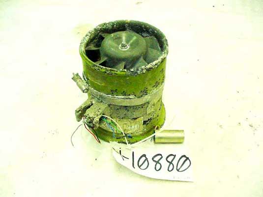 The fan housing and fan impeller blade hub were recovered as separate units. The electric fan motor was not recovered. The fan housing exhibited severe damage.