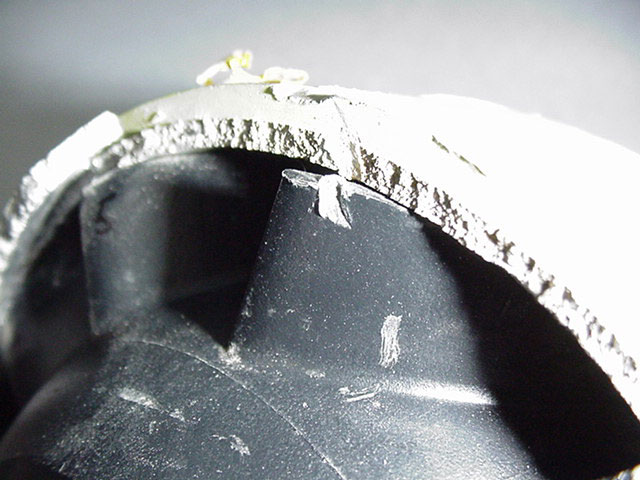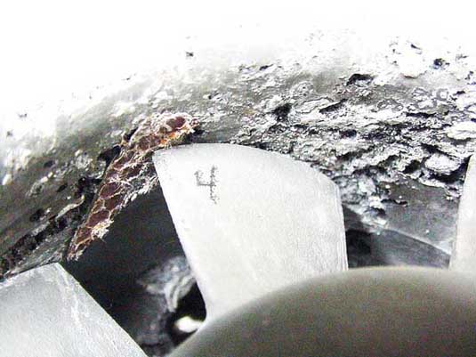 The inner fan housing exhibited distinct impression marks in the fan impeller blade tip path.