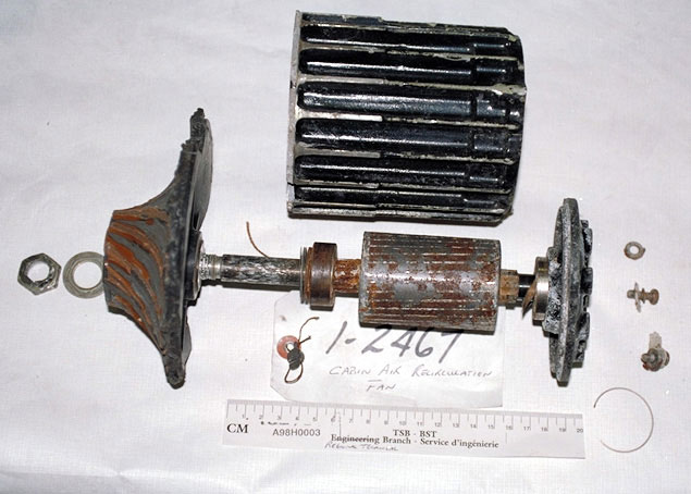 The fan was recovered as a single unit. It was identified by tag as EG&G Rotron PN 034964, SN A01556, and Swissair ASN 0001, IDN 474986.The fan retained a metal V-shaped band clamp on the fan housing inlet, but the associated ducting had broken away. The fan housing was broken at mid-span, adjacent to the stator blades on the exhaust or fan outlet side (which faces forward in the aircraft).