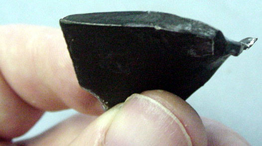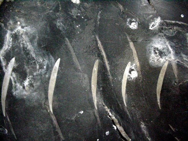 A faint, arc-shaped mark was noted on the underside of one of the detached pieces that matched the location and pattern of the rotational gouges exhibited on two of the other fan impellers.