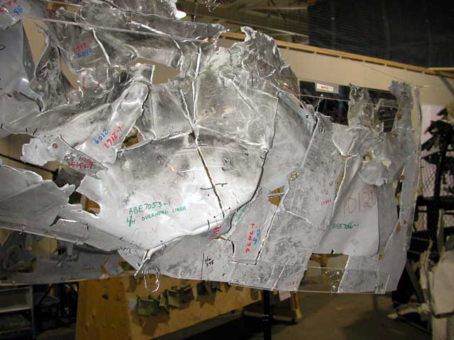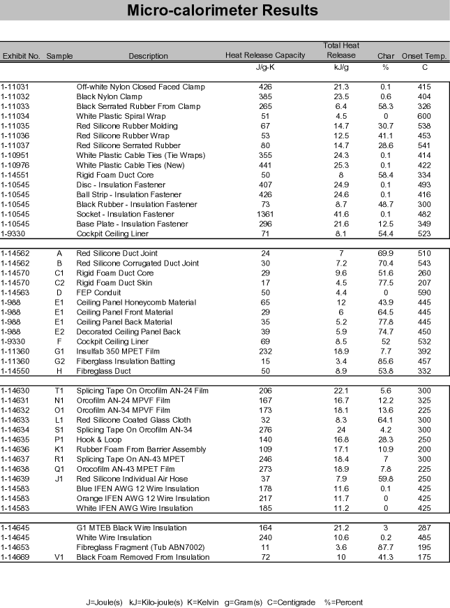 The test section was approximately 18-feet long and was instrumented with thermocouples, smoke metres, calorimeters, and gas sampling equipment. Ceiling panels, with flammability characteristics similar to those in the occurrence aircraft, were installed. Two layers of MPET-covered thermal acoustic insulation blankets were installed in the attic area above the ceiling. One layer was installed between each frame of the fuselage against the skin of the aircraft; the second layer was installed over the first layer of insulation and over the frames. The seams between the second layer of insulation blankets were sealed with MPET-covered insulation splicing tape. The insulation blankets were constructed with MPET-type cover material bearing the marking Insulfab 350, DMS 2072L, Type 2, Class 1, Grade A. This material was of a different revision letter (L versus K) than the MPET-type cover material that had been used in the occurrence aircraft.