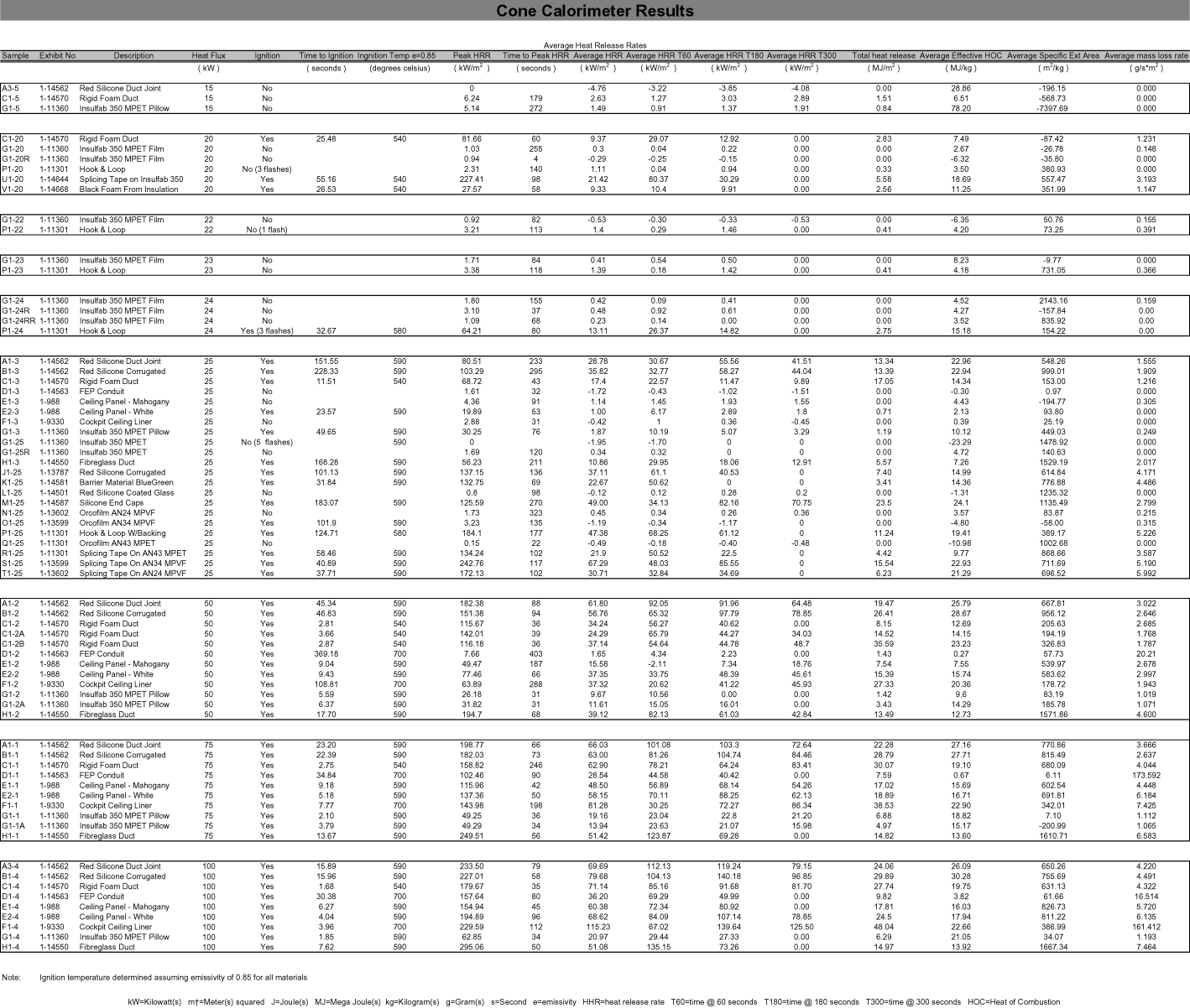Burn tests were conducted in the test rig using Insulfab 350, DMS 2072K, Type 2, Class 1, Grade A, MPET-covered insulation blankets. The tests were initiated by igniting the cover material with a barbeque lighter. The Insulfab 350 insulation material ignited and developed into a robust and self-sustaining fire when the insulation material was pre-heated. Pre-heating was therefore assessed to be a significant factor affecting the flammability of the composite foam duct and the Insulfab 350, DMS 2072K, Type 2, Class 1, Grade A insulation blankets.