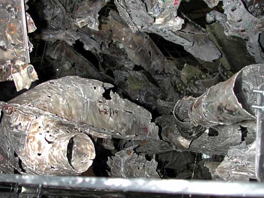 The deposits were analyzed and determined to be resolidified aluminum; the precise alloy was not determined. There was no heat damage on the window diffusers, but each diffuser exhibited a light soot accumulation.