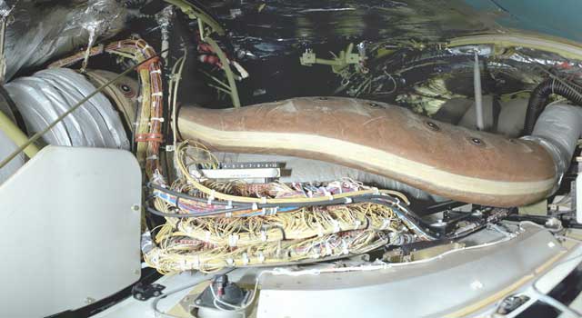 The overhead panel wires enter and leave the housing through one of two oval holes located on the left and right side of the aft wall of the housing. System wires that leave the housing through the left side oval hole are primarily in wire run AML and are routed aft above the cockpit ceiling. The recovered segments of the AML wire run extended up to 76.2 cm (30 inches) aft of the oval hole. System wires that leave the housing through the right side oval hole are primarily in wire run AMK and are routed either aft above the cockpit ceiling or outboard of the avionics CB panel. The recovered segments of the AMK wire run extended up to 8.5 inches aft of the oval hole. The overhead CB panel bus feed wires also exited through the right side oval hole. These wires were routed aft along the left side of the CB panel, across the aft end of the CB panel, and through the right side oval hole in the aft end of the housing. Recovered segments of the overhead CB panel bus feed wires extended up to 25 inches aft of the right housing oval hole.