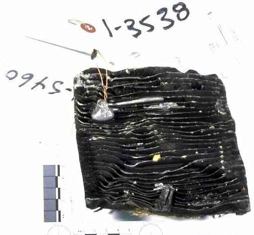 A segment of wire harness from the CVR control panel was recovered. A two-conductor shielded wire and a 24 AWG wire exhibited black discolouration on the polyimide insulating film; the copper conductor was not embrittled or melted. The black discolouration of the polyimide film was consistent with damage to an oven sample that was exposed to approximately 510°C (950°F) for 7.5 minutes. The area of heat damage was approximately 6 cm (2.5 inches) forward to 13 cm (5 inches) aft of the oval hole on the right side in the aft end of the housing assembly. Additional wire harnesses and components from the overhead panel were recovered and analyzed. This analysis resulted in numerous and consistent indications of temperatures exceeding 482°C (900°F) for several minutes in the area of the right oval hole in the aft wall of the housing. The region of high temperature extended aft for several inches from the right oval hole in the housing.