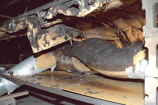 Two layers of Insulfab 350, DMS 2072K, Type 2, Class 1, Grade A, MPET-covered insulation were installed in the burn rig to simulate the between-frame and over-frame insulation in the aircraft. The insulation blankets were provided by Swissair and were identical to the blankets that had been installed in the occurrence aircraft. Two pieces of flat stock were installed in the rig to simulate door tracks. Frames were installed in the rig; however, the frames were spaced 50 cm (20 inches) apart, whereas the frames in the aircraft were spaced 20 to 23 cm (8 to 9 inches) apart. The rigid foam duct was installed in the burn rig and ducts were attached to both ends. The adjoining ducts were wrapped in Orco film AN 18R PVF-covered insulation blankets, similar to the installation in the MD-11. A blower motor was attached to the end of the duct to provide airflow through the duct assembly. Three 35-cm (10-inch) ducts were installed in the burn rig to simulate the three conditioned air riser ducts on the right side of the fuselage. These ducts were wired together and were covered with a single layer of insulation material. Ceiling panels were installed within the burn rig to simulate those installed in the aircraft. Thermocouples were installed at numerous locations within the burn rig. Camera ports were installed in the burn rig for conventional and infrared photography.