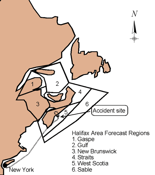 The FACN35 covered Halifax and the surrounding maritime provinces. This district comprises the following regions: Gaspé, Gulf, New Brunswick, Straits, West Scotia, and Sable. The accident site is within the West Scotia region (area 5) of the FACN35. The prognosis for the FACN35, issued at 2330 on 2 September 1998 and valid from 0000 to 1200 on 3 September 1998 indicated that, at 0000, there was a weak upper trough running north-northeast to south-southwest in the western part of the district. This trough was forecasted to move eastward at 20 knots to lie in the vicinity of Fredericton, New Brunswick, at 1200. At 0000, Hurricane Danielle was forecast to pass well south of the Sable region overnight. Patchy, low-level moisture was forecast over all the regions, becoming moist at all levels west and near the trough and over the Sable region. Light, easterly winds were forecast over the regions, increasing to moderate and strong easterly winds over the Sable region after the mid-period of the forecast. The forecast weather for the West Scotia region called for scattered, occasionally broken clouds at 2 000 to 3 000 feet with tops at 8 000 feet, broken, occasionally overcast clouds at 10 000 feet with tops at 16 000 feet, and high, broken clouds above 25 000 feet. Visibility was forecast to be greater than 6 sm. The forecast for the district included severe, clear icing in the cumulonimbus clouds and moderate, mixed icing in the altocumulus and towering cumulus. However, light to moderate rime icing was forecast elsewhere in clouds above freezing level. The freezing level was forecast at 9 000 feet asl in the northern part of the district, rising to 13 000 feet asl in the southern part. The forecast turbulence was moderate to severe in convective clouds, and otherwise light to nil.