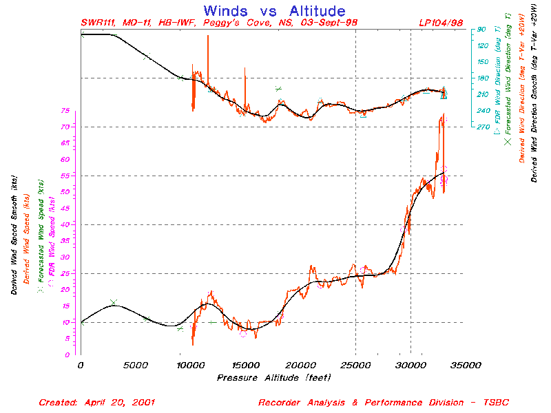 The SR 111 FDR data was analyzed to determine the actual winds and temperatures during the descent in the Halifax area. In summary, from 33 000 feet down to 18 000 feet the wind direction veered from approximately 200 to 270°T; from 18 000 to 10 000 feet, the wind direction backed to 180°T. From 33 000 to 10 000 feet, the wind velocity decreased from 66 knots to 4 knots and the air temperature increased from –40 to 4°C; the temperature at 25 000 feet was –25°C and at 12 000 feet was 0°C. (The magnetic variation for Halifax is 20 degrees west.)