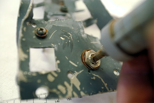 Some of the remains of the SMOKE ELEC/AIR selector were recovered and examined, including the threaded shaft neck, the two mounting nuts, the lock tab and washer arrangement, and the switch base plate. Two indentations were noted in the threaded shaft neck and an exemplar selector was requested from the manufacturer for comparison. (The exemplar selector was received from Honeywell and was exhibited as 1-12817. A label on the selector identified it as being manufactured by Janco Corporation in Burbank, California, and rated at 5 A 115 V AC. The number 51-2006 (8743) was stamped on the body of the selector.)