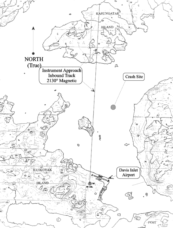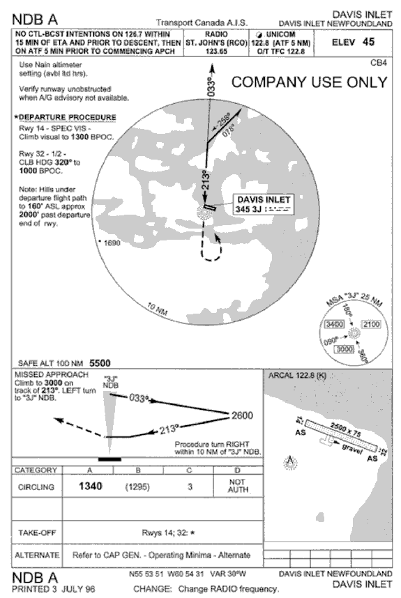 There is one instrument approach for Davis Inlet, the non-directional beacon (NDB) A. This approach is based on the Davis Inlet NDB, which is south of the runway's extended centreline. The published instrument procedure is a circling approach. The MDA is 1340 feet asl (1295 feet above ground level), and the published advisory visibility is 3 sm. The approach procedure is to the north-northeast of the airport and, for the most part, over the ocean. The missed approach point is at the NDB (see Appendix C).