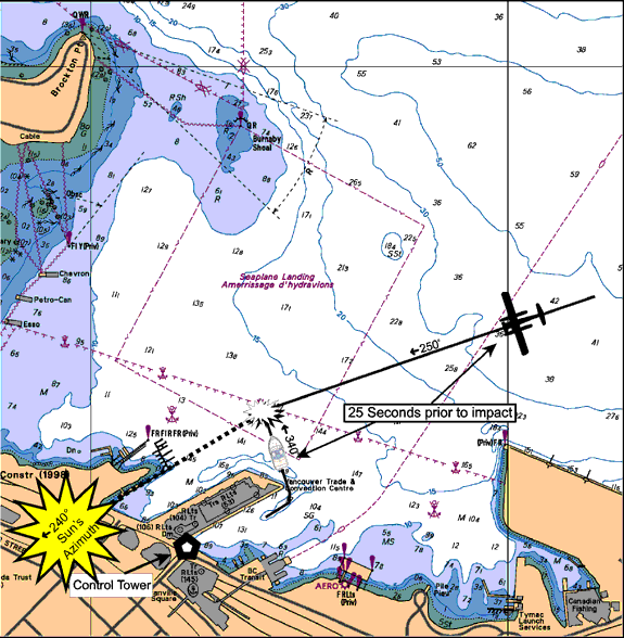 Weather at the time of the occurrence was reported as CAVOKFootnote 2 on the Vancouver Harbour tower automatic terminal information service (ATIS),Footnote 3 with a wind from 250 at 5 to 10 knots. Temperature was 15 Celsius. Landings were being carried out toward the west. The sea was mostly calm, with light ripples on the water. The sun's position at the time was approximately 240 in azimuth and 21.5 above the horizon. Sunlight was reflecting off the water's surface, creating a large area of bright glare. Witnesses who viewed the collision from boats on the water assessed the glare to be extreme, accentuated by the light ripples on the water's surface. The aircraft's final approach course was about 250, and the glare patch on the water coincided with the position of the boat as the aircraft descended down the last few hundred feet toward the water(see Appendix A).