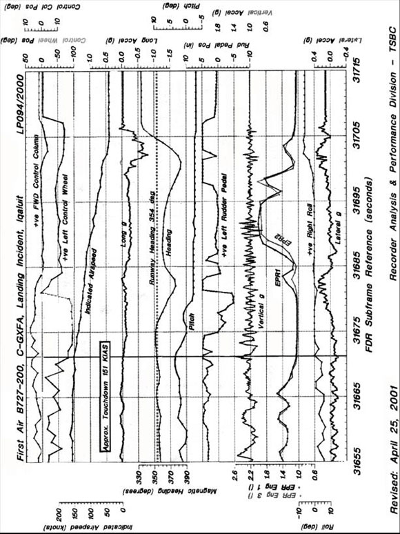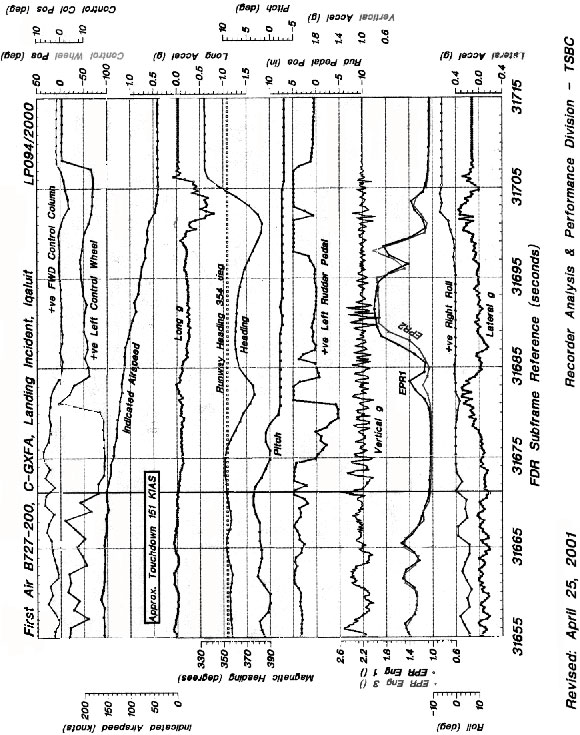 The Boeing 727, C-GXFA, operating as First Air Flight 860, was on a scheduled flight from Ottawa, Ontario, to Iqaluit, Nunavut, with 7 crew members and 52 passengers on board. Iqaluit Airport was receiving its first major snow squall of the winter, and snow-clearing operations were under way. The wind was from the east at approximately 20 knots with gusts to 30 knots. The snow-clearing vehicles left the runway and remained clear while the flight was conducting an instrument approach to Runway 35. Because of strong winds, the approach was discontinued approximately five nautical miles from the airport, and a second approach to Runway 35 was carried out. After touching down near the runway centreline, the aircraft travelled off the left side of the runway, then returned to the runway surface. The aircraft then drifted to the left and came to rest 7000 feet from the threshold of Runway 35. The nose wheels and the left main wheels were off the runway in the mud west of the runway. An emergency evacuation was ordered, and all passengers and crew exited the aircraft without injury. The aircraft received only minor damage.