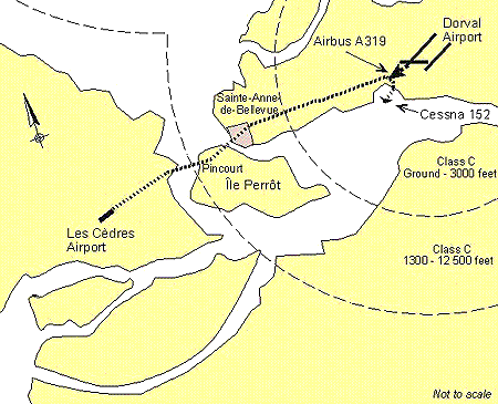 The Cessna pilot was aware of the airspace classification in the vicinity of Dorval. After take-off, the pilot established the aircraft altitude at 1100 feet asl to remain below the Class C airspace, which is based at 1300 feet asl and which overlies Île Perrôt and the western tip of the island of Montréal. The pilot planned to follow Highway 20 eastbound only as far as Sainte-Anne-de-Bellevue, 10 nm west southwest of Dorval and outside the Dorval control zone. She thought that the aircraft had not yet passed Pincourt on Île Perrôt when she saw Dorval airport directly ahead. She immediately recognized the navigation error, performed a general lookout, and then began an immediate right turn with the intention of returning to Les Cèdres. During the right turn, the Cessna passed in front of the Airbus. The occupants of the Cessna did not see the Airbus.