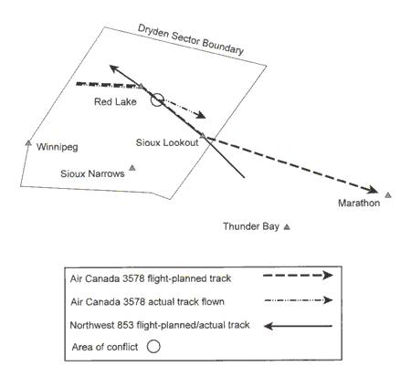 Air Canada flight ACA3578, an Airbus A320, departed Calgary, Alberta, en route to Toronto, Ontario, at flight level (FL) 370. Northwest Airlines flight NWA853, a Boeing 757, departed Detroit, Michigan, en route to Anchorage, Alaska, at FL350. Both flights were under radar control. NWA853 requested and received clearance to climb to FL370 approximately 43 nautical miles (nm) southeast of the Red Lake, Ontario, VOR (VHF omnidirectional range). When NWA853 was approximately 35 nm southeast of the Red Lake VOR, the air traffic controller noticed that the two flights were at the same altitude, travelling toward each other on reciprocal tracks. He issued instructions to reestablish separation, but the two aircraft passed with 1.5 nm horizontal and 600 feet vertical spacing. The required minimum separation was 5 nm horizontally or 2000 feet vertically.