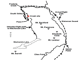 One of the managers of the camp, who was on a logging road in the south valley, advised the pilot to come to the Frederic Creek area because it was clear of cloud. The pilot then flew northeast to Wakeman Sound, where he advised that he could descend below the cloud to the Frederic Creek inlet. The aircraft flew west along Frederic Creek until turning left toward the pass in the south Frederic Creek valley. The pass crosses a north-south divide (saddle); the valley to the east of the divide turns south immediately and descends to Mackenzie Lake. (See Figure 1.)