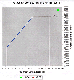 The maximum certificated all-up weight (MAUW) of the DHC-2 Beaver on floats is 5090 pounds, with an aft centre of gravity (CG) limit of 6.1 inches aft of the datum. In comparison, the MAUW of the Beaver on wheels is 5100 pounds, but the aft CG limit is 8.8 inches aft of the datum.