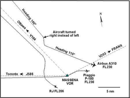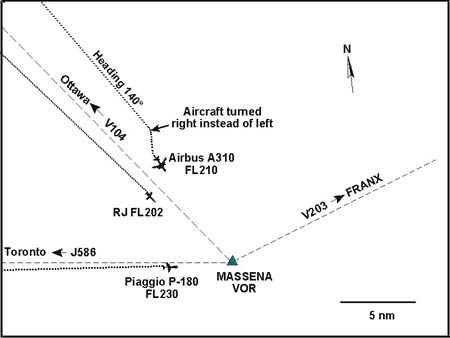 A Royal Airlines Airbus A310, Flight 4522, registration C-GRYV, took off from Runway 32 at the Ottawa / Macdonald-Cartier International Airport en route to John F. Kennedy International Airport in New York City. About one minute later, an Air Canada Bombardier Regional Jet (RJ), Flight 662, registration C-FZAQ, took off from Runway 25 at the Ottawa International Airport, en route to Boston, Massachusetts. Both were cleared to maintain 15 000 feet and were then handed off to the Valley sector of the Montréal Area Control Centre. At that time the Airbus was about 10 nautical miles (nm) north of, and slightly behind, the RJ and was on a heading of 140° . The RJ was on a heading of about 130° proceeding directly to the Massena VOR (VHF omnidirectional radio range). Both aircraft were cleared to maintain flight level 190 (FL190) and then FL220. A loss of separation occurred when the aircraft closed to 3.7 nm with less than 1000 feet of vertical separation. Subsequently, the Airbus, at FL230, conflicted with C-GLEM, a Piaggio P-180 at FL230 inbound to St. Hubert, Quebec. These aircraft approached to 3 nm. The minimum separation required in both instances was 5 nm lateral or 1000 feet vertical spacing.