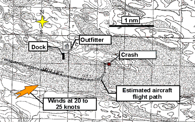 The outfitter is located on the north shore of Mollet Lake. The lake is 1 nm wide and is oriented east-west. The aircraft flew the downwind leg, proceeding east along the south shore of the lake. About 1 nm east of the outfitter, at an altitude of about 500 feet above ground level, the pilot made a left turn and proceeded north on the base leg. On approaching the north shore and the rising terrain immediately north of the lake, the aircraft was shaken and then turned right, taking it farther away from the outfitter. Meanwhile, witnesses heard an increase in engine noise. In the turn, the seaplane pitched nose-down and struck the surface of the lake, right wing first. The aircraft crashed 1 nm from the outfitter at about 1735.