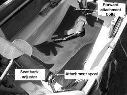 The seat is a slung cloth hammock (See Figure 1 - Seat Assembly). The front attachment, under the pilot's legs, is secured to the floor by three bolts, and is not adjustable. The aft attachment, behind the pilot's shoulders, is a spool attached to a movable seat frame. The spool allows the pilot to vary the number of material wraps, and provides height adjustment. The seat back frame adjusts fore and aft to move the pilot's body fore or aft. Adjustment is accomplished by selecting the appropriate hole in the spring loaded lever and aligning it with a stationary pin attached to the airframe structure. In the most forward position, the pilot is in a semi-reclined seating position; the further rearward the selection, the more reclined the upper torso of the occupant. Examination of the glider seat assembly did not establish the exact position of seat adjustment at impact. After the accident, the right and centre attachment bolts were found to have pulled out of their anchor nuts, the bolts remaining within the seat fabric and aluminum attachment strip. The left bolt was still in its anchor nut, but was only finger tight.