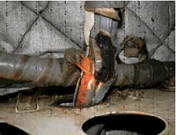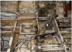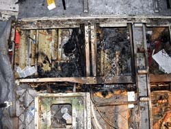 The fire was located below the floor level of the aft cargo compartment in an area defined longitudinally by fuselage station (FS) 1385 and FS 1412 and laterally by left buttock lineFootnote 3 (LBL) 6 and right buttock line (RBL) 50. The fire burned holes through the structural floor beam web at FS 1395, and consumed the thermal acoustic insulation on both sides of the floor beam. Also damaged were the underside of the floor board between RBL 22 and RBL 44, potable water lines, heater ribbons, and associated electrical wiring (see Photo 1).