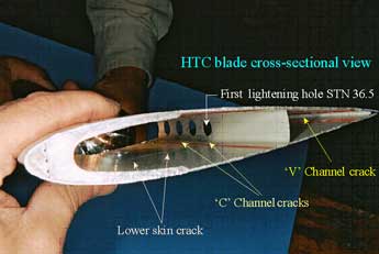 The visible crack on the exterior surface of the blade measured 4.5 inches long and ran in a chord-wise direction from the approximate aft edge of the spar to the trailing edge of the lower skin at STN 36.5. Once the blade was sectioned it was found that, in addition to the lower skin crack, the "V" channel at the trailing edge of the blade had a longitudinal crack that.measured 2.7 inches long. This crack was roughly centred about the lower skin crack and the "C" channel crack, below the first lightening hole. No cracking of the spar or upper skin were detected in the area of the lower skin crack. (Photo 1)