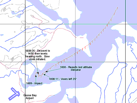 At 1800, while 23 nautical miles (nm) from the Goose Bay airport, the aircraft had descended to 2000 feet and was cleared for a straight-in precision approach radar (PAR) to Runway 26. Air traffic control radar data showed that the aircraft proceeded inbound at 2000 to 2100 feet, with occasional small corrections to maintain the on-course track (See Appendix A - Final Flight Path). At 1808, just inside 6 nm from Goose Bay, the pilot radioed that the attitude indicator had failed. The PAR controller immediately reverted to "No Compass" approach procedures, advising the pilot to disregard the compass.