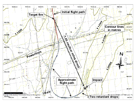 In the minutes leading up to the accident, the bird dog aircraft flew the approximate route while the AAOs determined that two separate retardant drops, forming a "V", would be required, and that the altitude over the drop zone would be 3700 feet above sea level (asl). Since a straight-out exit from the first run over the drop zone (heading of about 155° magneticFootnote 1) would take the Electra into rising terrain, the AAOs decided that the safest exit route after the drop was a 35-degree right turn into a wide valley, which was substantially flatter, and toward Moyie Lake. High-tension electrical power lines crossed beneath the exit route from the fire site, and although the lines were lower than the proposed flight path, the AAOs included them in their summary as a caution.