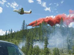 On board the Turbo Commander bird dog were its pilot and two air attack officers (AAOs) from the British Columbia Forest Service (BCFS). Part of the AAO function is to assess ground fire characteristics and devise the most effective and safe flight paths, retardant dispersal patterns, and delivery profiles. The bird dog pilot is an integral partner in this process and provides operational flight performance input to help the AAO plan and coordinate the attack on a fire scene. The pilot is involved in planning and checking the aircraft routes over the drop zones, especially in leading the tankers into their retardant drop flight paths. Once the planned flight route is decided upon, the bird dog pilot flies the aircraft on that profile in a demonstration run for the tanker pilots. During the demonstration flight, the AAO provides a real-time commentary to the tanker pilots, identifying the routes in and out, landmarks, salient points, and hazards along the flight path.