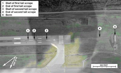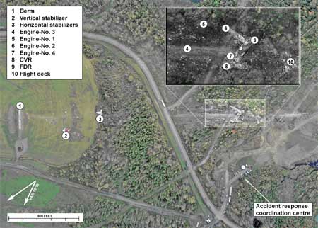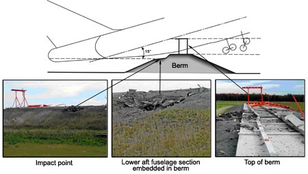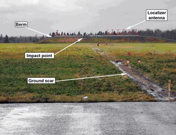 Grass was uprooted in the area beyond the end of the runway where the aft section of the aircraft fuselage had dragged on the ground; as well, a number of approach lights for Runway 06 were destroyed. The ILS localizer antenna structure sustained significant damage when the aircraft struck the berm. Telephone and power lines adjacent to the main crash site were severed just before final impact. The surrounding wooded area was heavily damaged by the post-crash fire. Unburned fuel contaminated the soil in the immediate area of the crash site, requiring an extensive environmental clean-up.