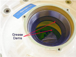 - The dislodged inner-bearing grease dam allowed grease to migrate from the inboard roller bearing of the right nosewheel to the inside of the nosewheel assembly. A reduction in lubrication increases the cage loads and may lead to bearing failures.