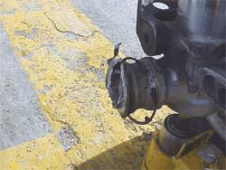 The nose landing gear wheel axle was examined and found to be fractured circumferentially in the vicinity of the collar (see Photo 3 and Appendix A). Both of the fracture surfaces appeared rugged with stains radiating from the inside diameter surface. In addition, the fracture was covered with a carbonaceous residue. There were indications that the axle had been subjected to high temperatures as the paint on both the inner and outer surfaces was blistered, flaking and discoloured, and the cadmium plating had melted and resolidified to form beads. The fracture originated on the inside diameter surface of the axle. The inner and outer diameters of the axle are cadmium plated for corrosion protection.