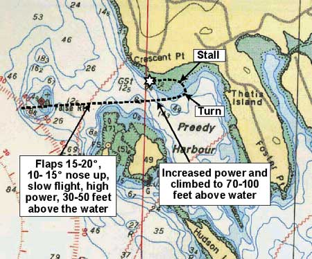 The aircraft was being flown in slow flight at a high power setting; the flaps were extended 15 to 20 degrees and the nose of the aircraft was 10 to 15 degrees nose up. During the initial portion of the pass, the aircraft's height was estimated to be 30 to 50 feet above the water. As the aircraft approached Thetis Island, the engine sound increased and the aircraft began to climb in a steep attitude to 70 to 100 feet above the water. The aircraft then banked sharply to the left and the nose dropped abruptly to a steep, nose-down attitude. There was no recovery from the descent, and the aircraft struck the water in a left-wing-down, nose-low attitude. The pilot was fatally injured on impact; the passenger escaped through the left-side rear window and was rescued from the water by nearby boaters. The accident occurred at 1019.
