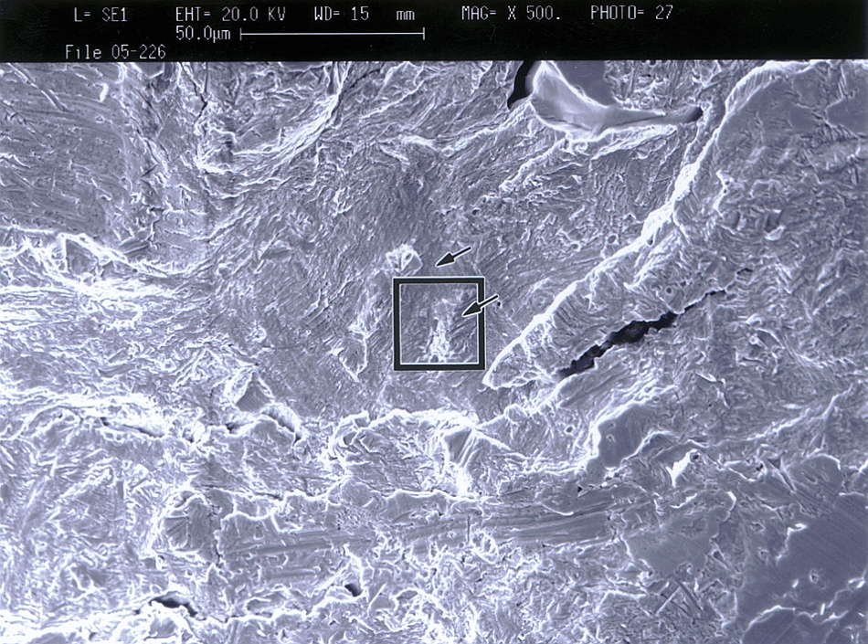 Optical microscopic examination of the blade fractures from the 2nd and 3rd stage rotors predominantly revealed overload features. All of the blades had failed at or slightly above the blade root and the blade stub remnants were bent opposite to the direction of rotation. However, one blade fracture in the 2nd stage was unique in that it showed a flat, transverse fracture surface from the leading edge back towards mid-spa that changed to a slanted fracture towards the trailing edge. Areas of the fracture surface towards the leading edge showed faint striations indicating a progressive failure mode. This blade fracture was sectioned from the rotor for detailed SEM examination.
